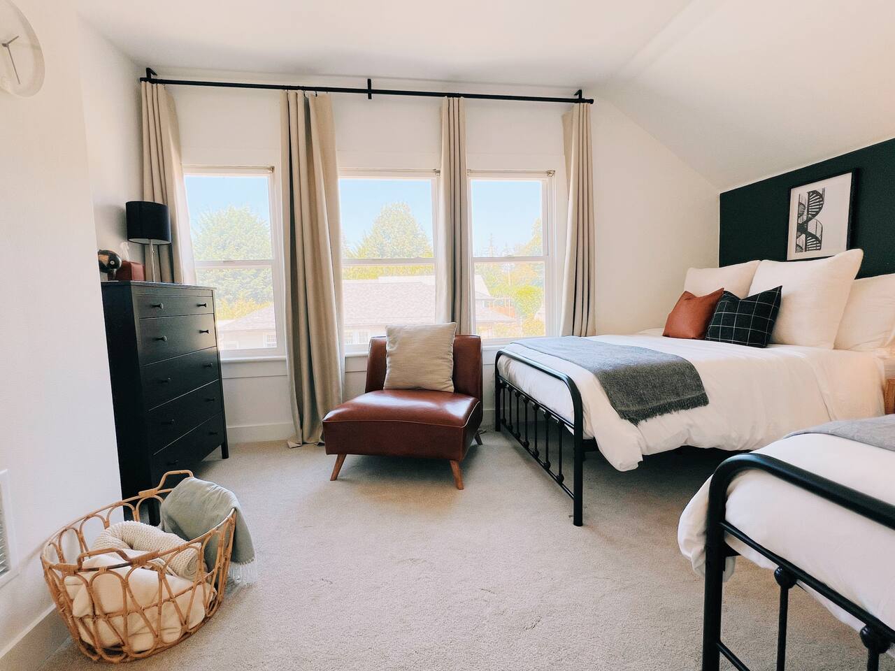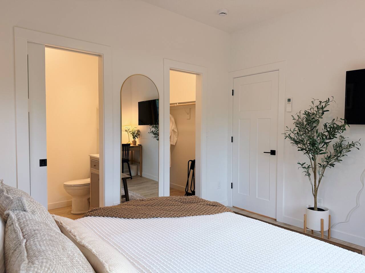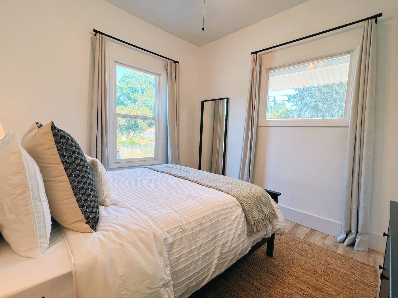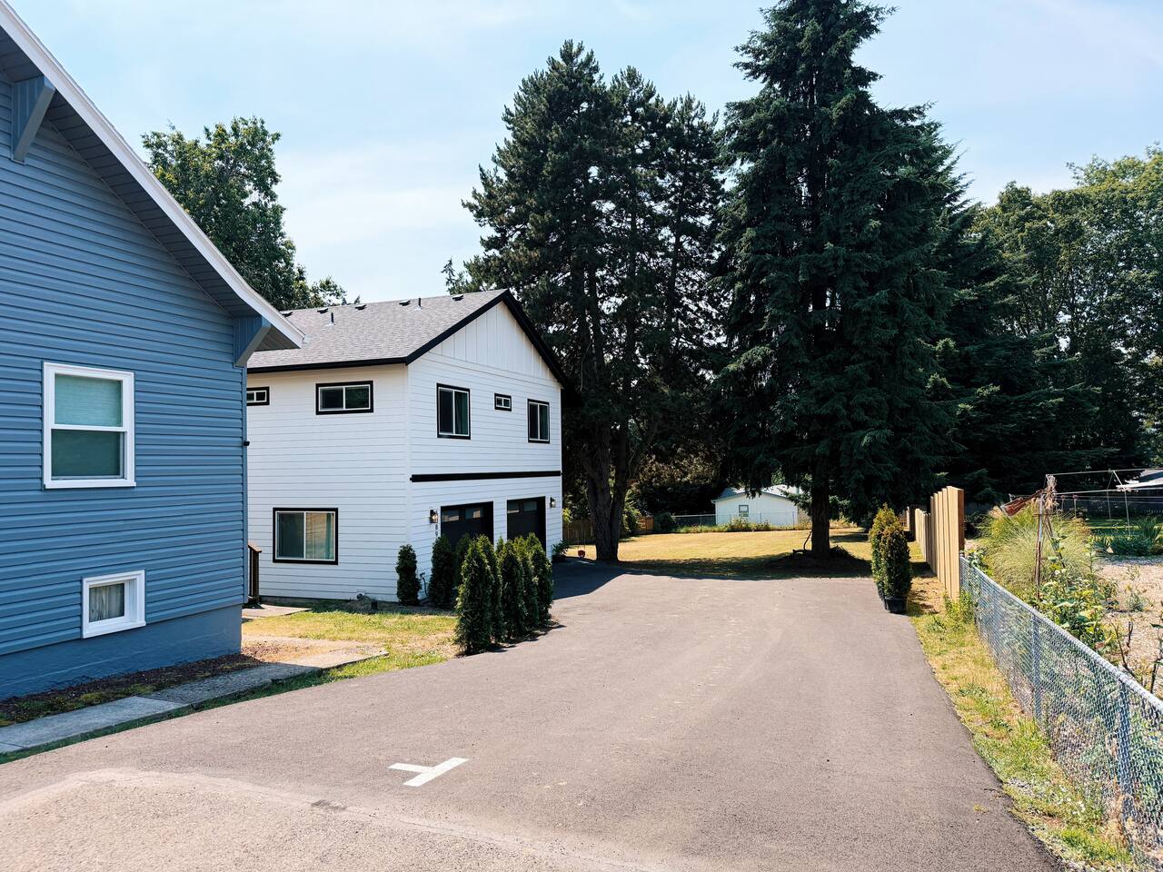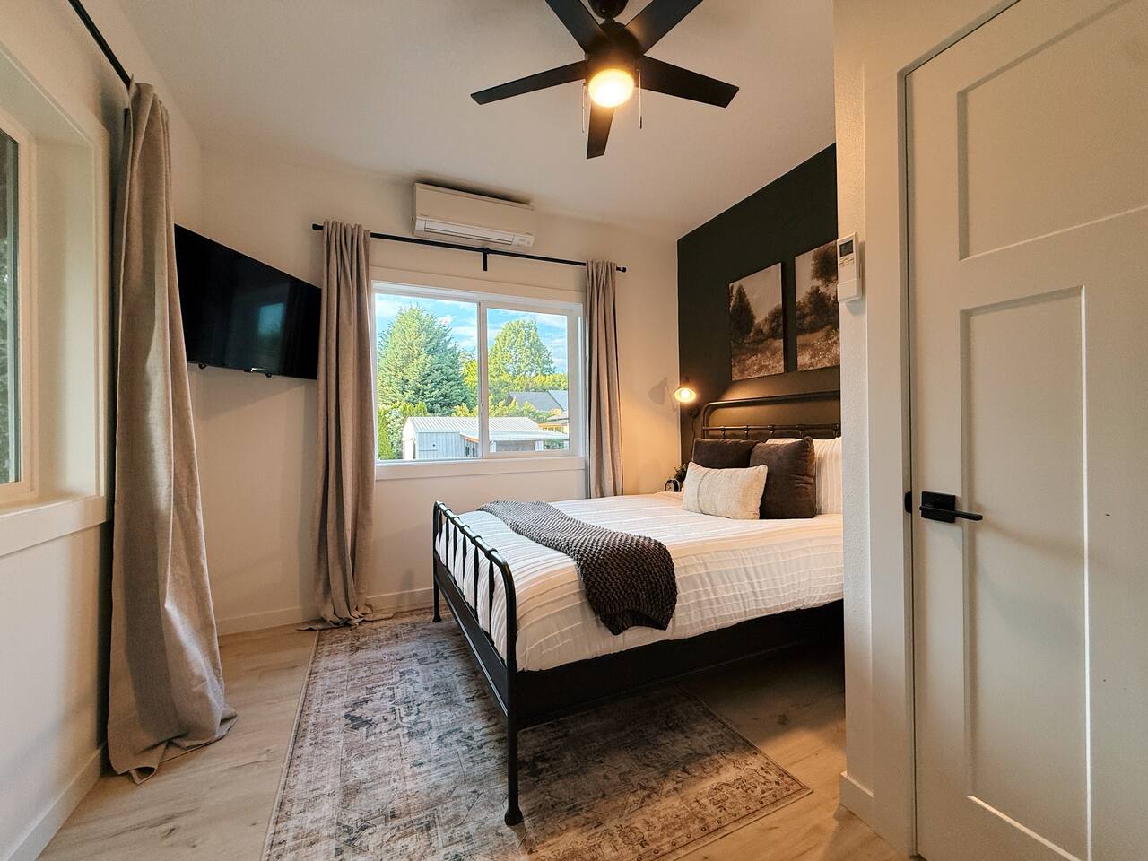 The Front (Gray) House: The main floor features a cozy bedroom and a full bathroom for easy access. Upstairs, you'll find two additional bedrooms, including a master suite with a king bed for ultimate comfort. There is a TV in every room for your enjoyment. The outdoor space is fully fenced, providing a safe area for play, relaxation, and even your pets use. Enjoy a BBQ on the patio, making the most of this delightful and functional outdoor area. The EV charging outlet is on the north side of the home, next to the marked parking stalls. The Back (White) House: The house contains a beautiful relaxing master suite with its own bathroom and king bed for ultimate comfort. The room also includes a work station for your convenience. Just across the hall, the second bedroom displays a darker, rustic vibe with a comfortable queen bed. The second bathroom is across from the washer and dryer. There is a TV in every room for your enjoyment. Enjoy a BBQ on the patio, or unwind in the vast green yard! There is also a garage on the main level that includes a parking stall for one (1) vehicle, a gym, and an EV charging outlet.