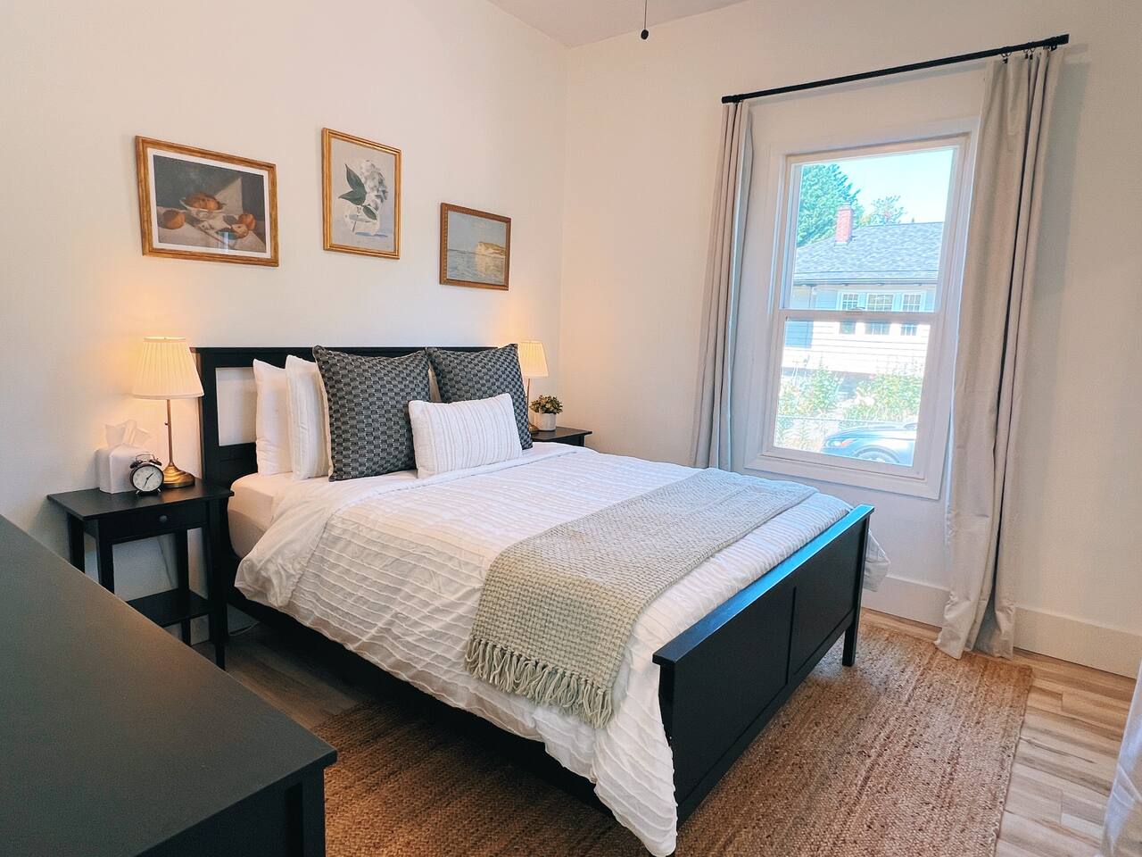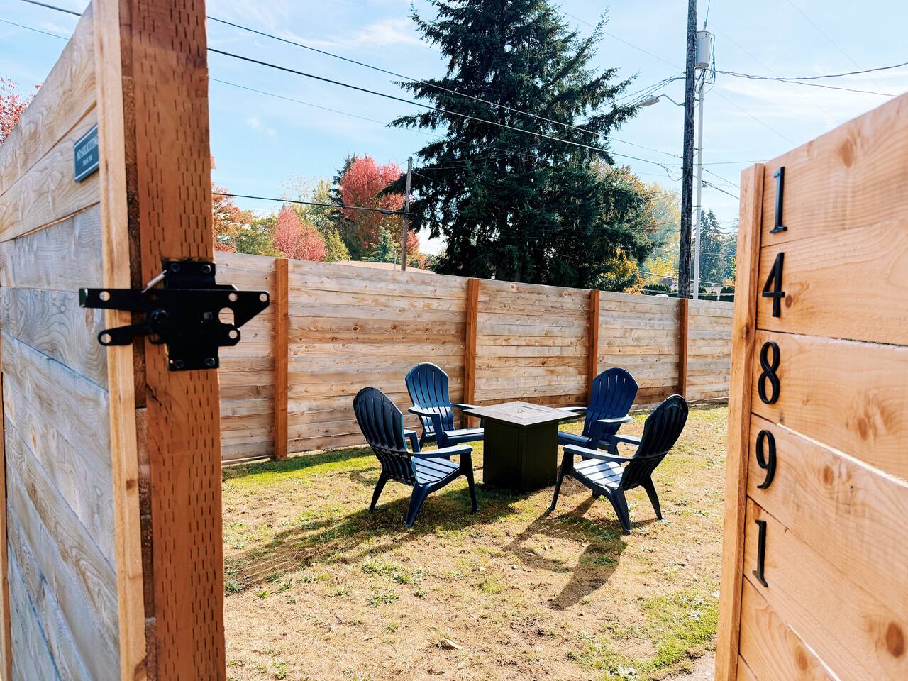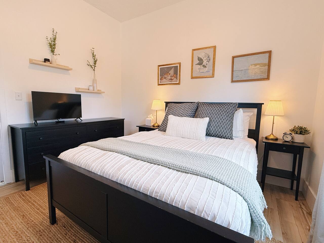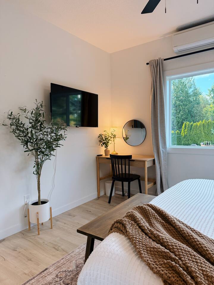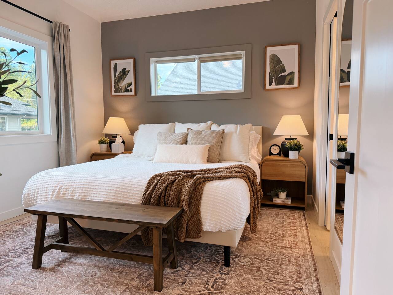 The Front (Gray) House: The main floor features a cozy bedroom and a full bathroom for easy access. Upstairs, you'll find two additional bedrooms, including a master suite with a king bed for ultimate comfort. There is a TV in every room for your enjoyment. The outdoor space is fully fenced, providing a safe area for play, relaxation, and even your pets use. Enjoy a BBQ on the patio, making the most of this delightful and functional outdoor area. The EV charging outlet is on the north side of the home, next to the marked parking stalls. The Back (White) House: The house contains a beautiful relaxing master suite with its own bathroom and king bed for ultimate comfort. The room also includes a work station for your convenience. Just across the hall, the second bedroom displays a darker, rustic vibe with a comfortable queen bed. The second bathroom is across from the washer and dryer. There is a TV in every room for your enjoyment. Enjoy a BBQ on the patio, or unwind in the vast green yard! There is also a garage on the main level that includes a parking stall for one (1) vehicle, a gym, and an EV charging outlet.
