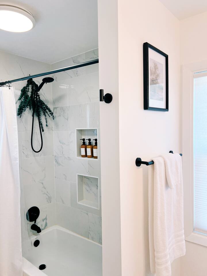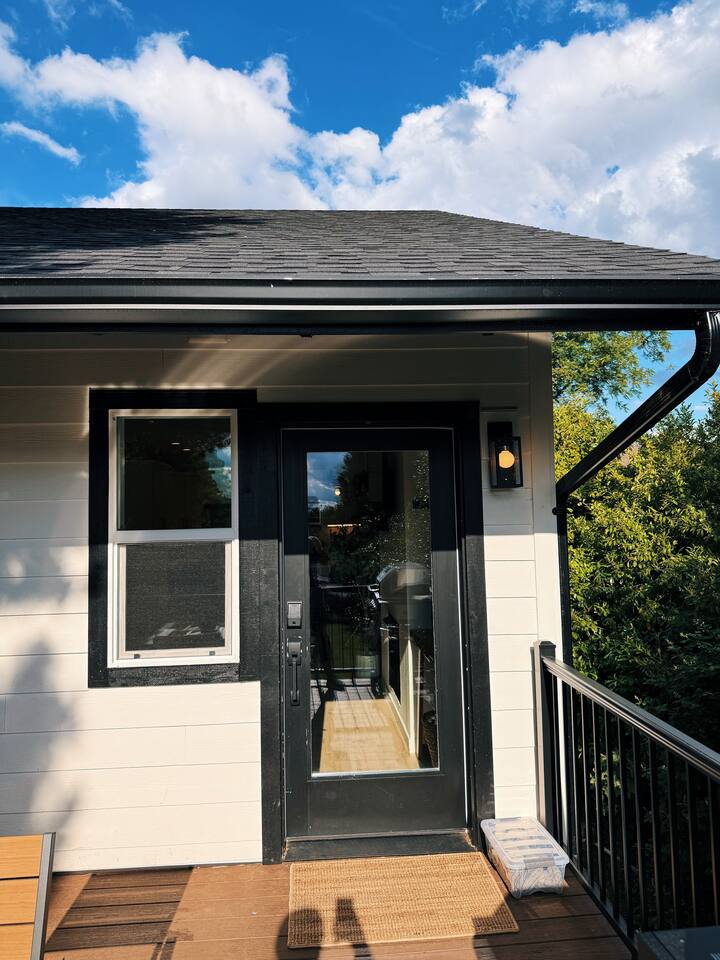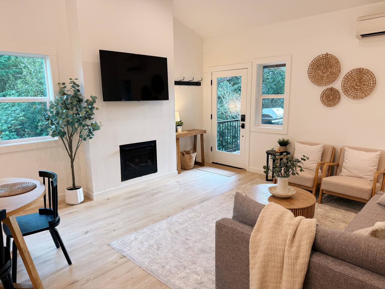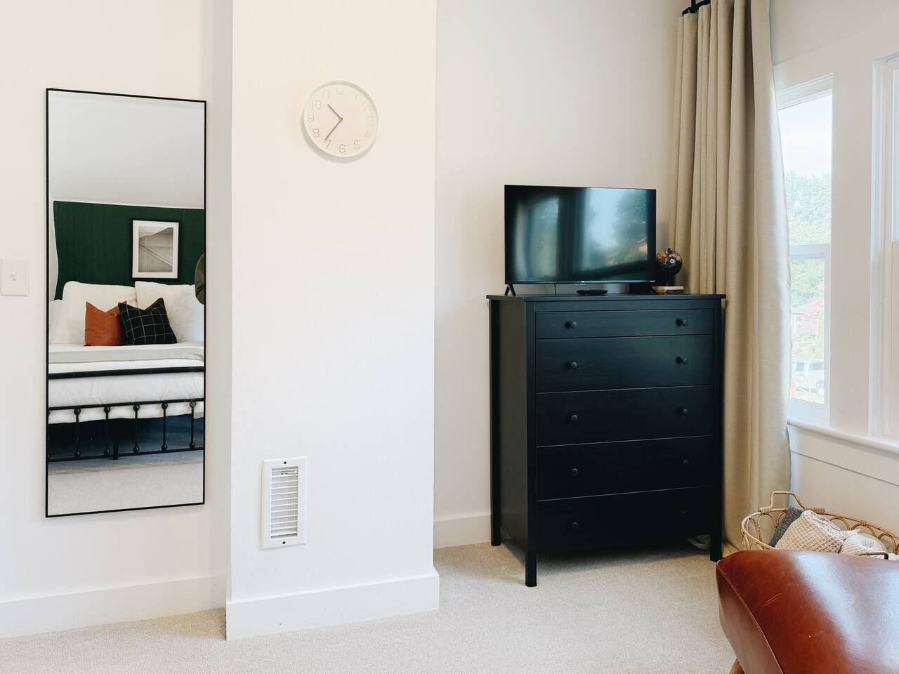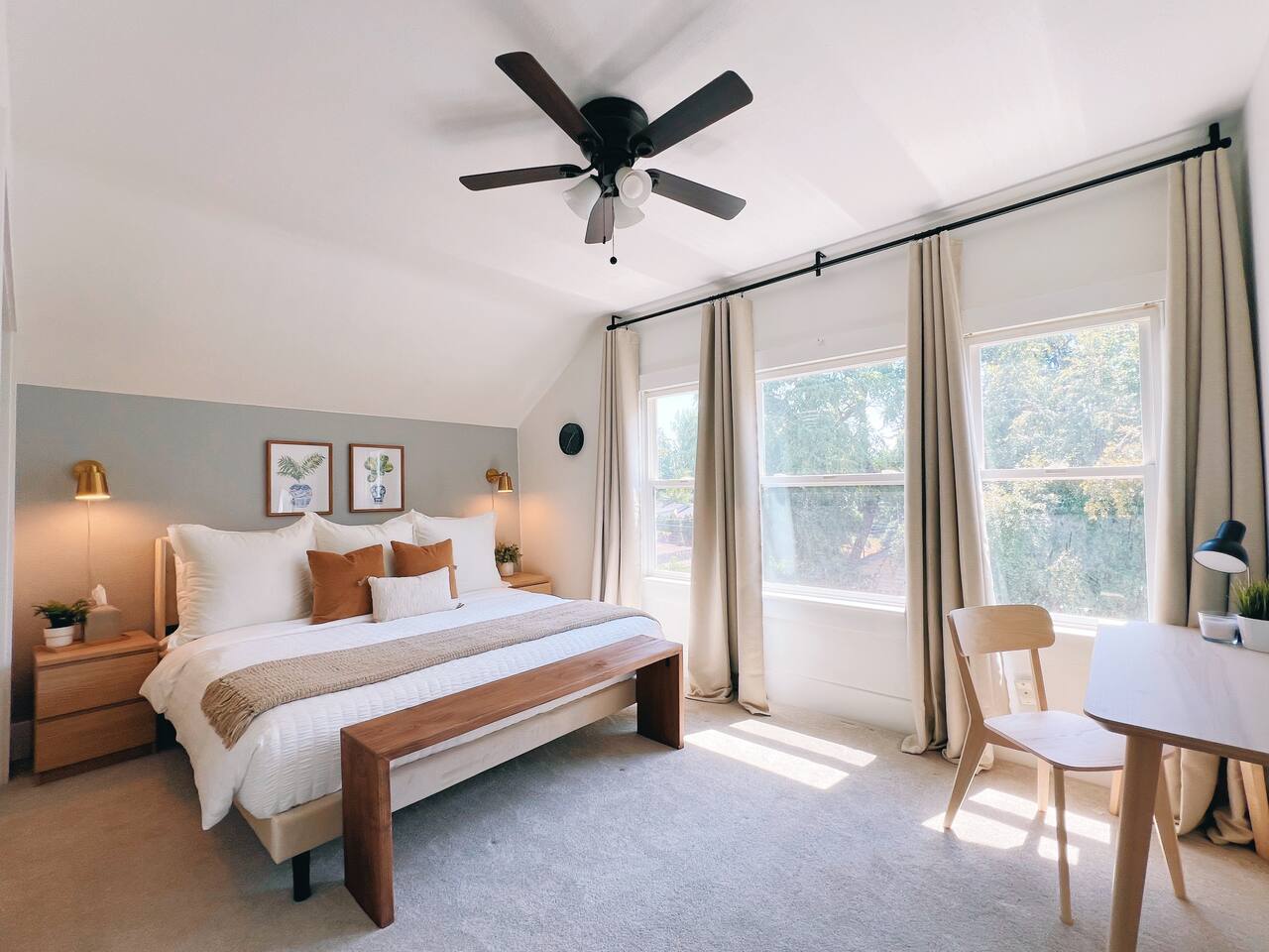The Front (Gray) House: The main floor features a cozy bedroom and a full bathroom for easy access. Upstairs, you'll find two additional bedrooms, including a master suite with a king bed for ultimate comfort. There is a TV in every room for your enjoyment. The outdoor space is fully fenced, providing a safe area for play, relaxation, and even your pets use. Enjoy a BBQ on the patio, making the most of this delightful and functional outdoor area. The EV charging outlet is on the north side of the home, next to the marked parking stalls. The Back (White) House: The house contains a beautiful relaxing master suite with its own bathroom and king bed for ultimate comfort. The room also includes a work station for your convenience. Just across the hall, the second bedroom displays a darker, rustic vibe with a comfortable queen bed. The second bathroom is across from the washer and dryer. There is a TV in every room for your enjoyment. Enjoy a BBQ on the patio, or unwind in the vast green yard! There is also a garage on the main level that includes a parking stall for one (1) vehicle, a gym, and an EV charging outlet.